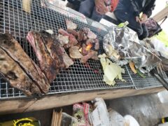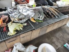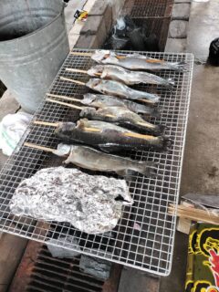 昼食の状況です。 みなさんでバーベキュー・釣ったニジマスの串焼きを楽しみました。